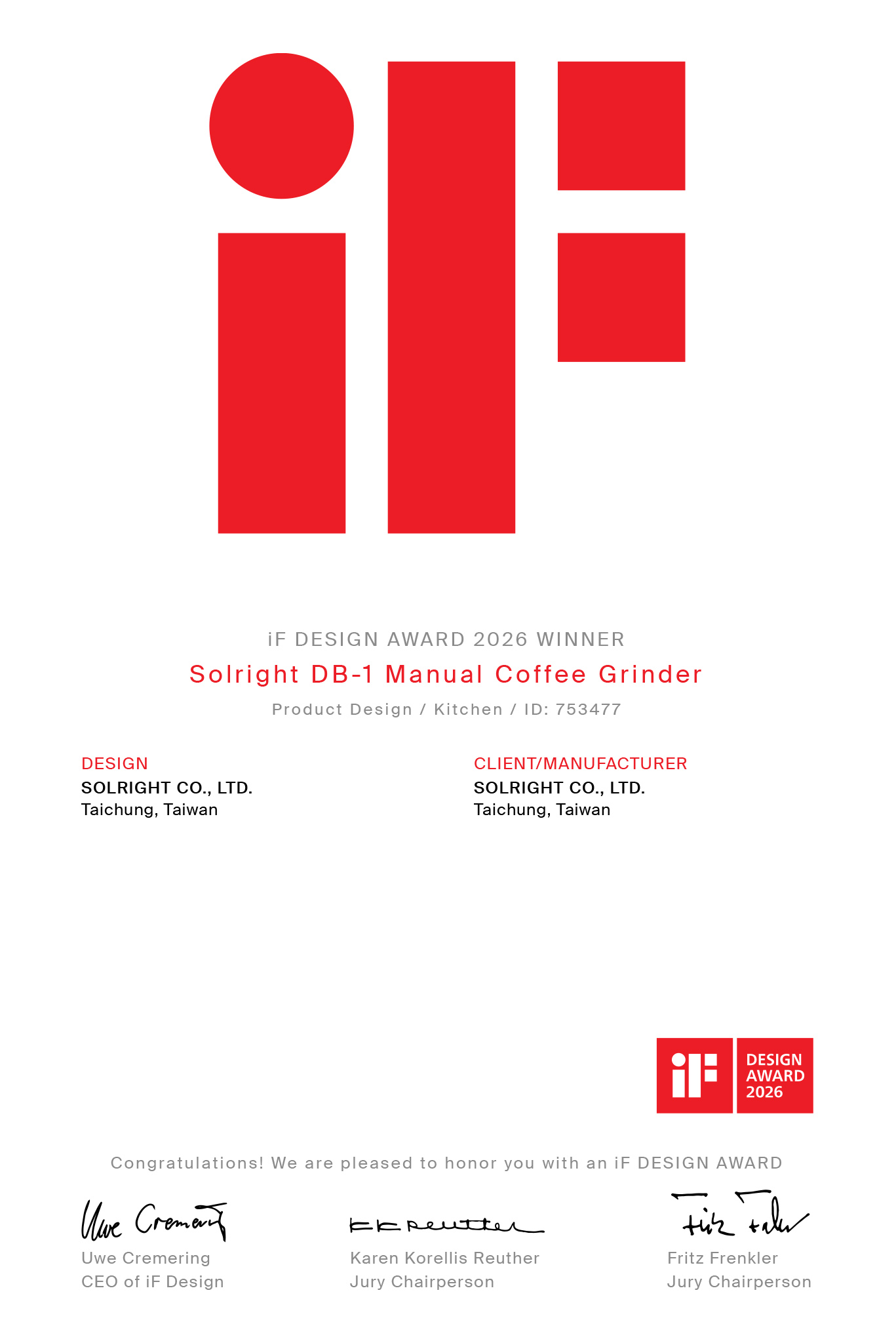 我們很開心宣布,Solright DB-1 手搖磨豆機正式榮獲2026 iF DESIGN AWARD。